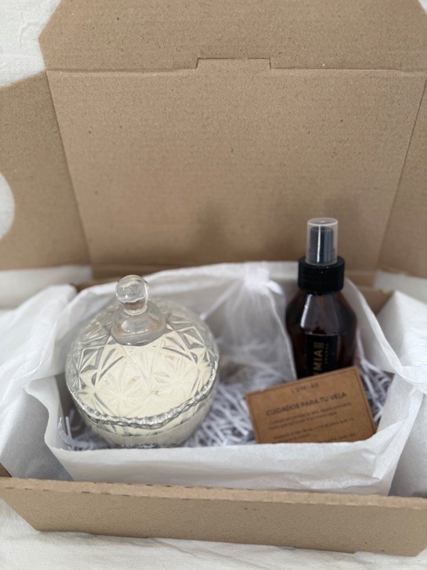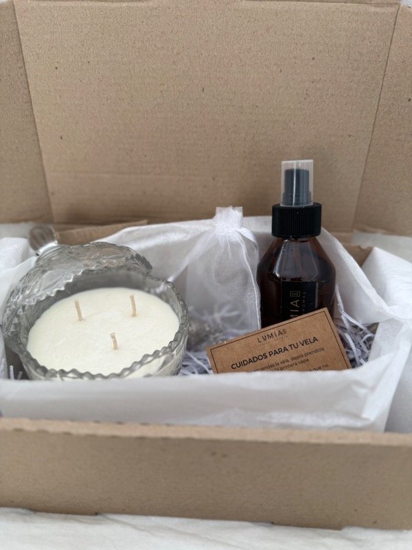 La caja contiene 1 vela Aurora con aroma a elección , 1home spray de 125 cc y 1 apagavelas